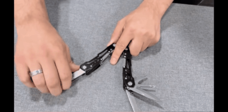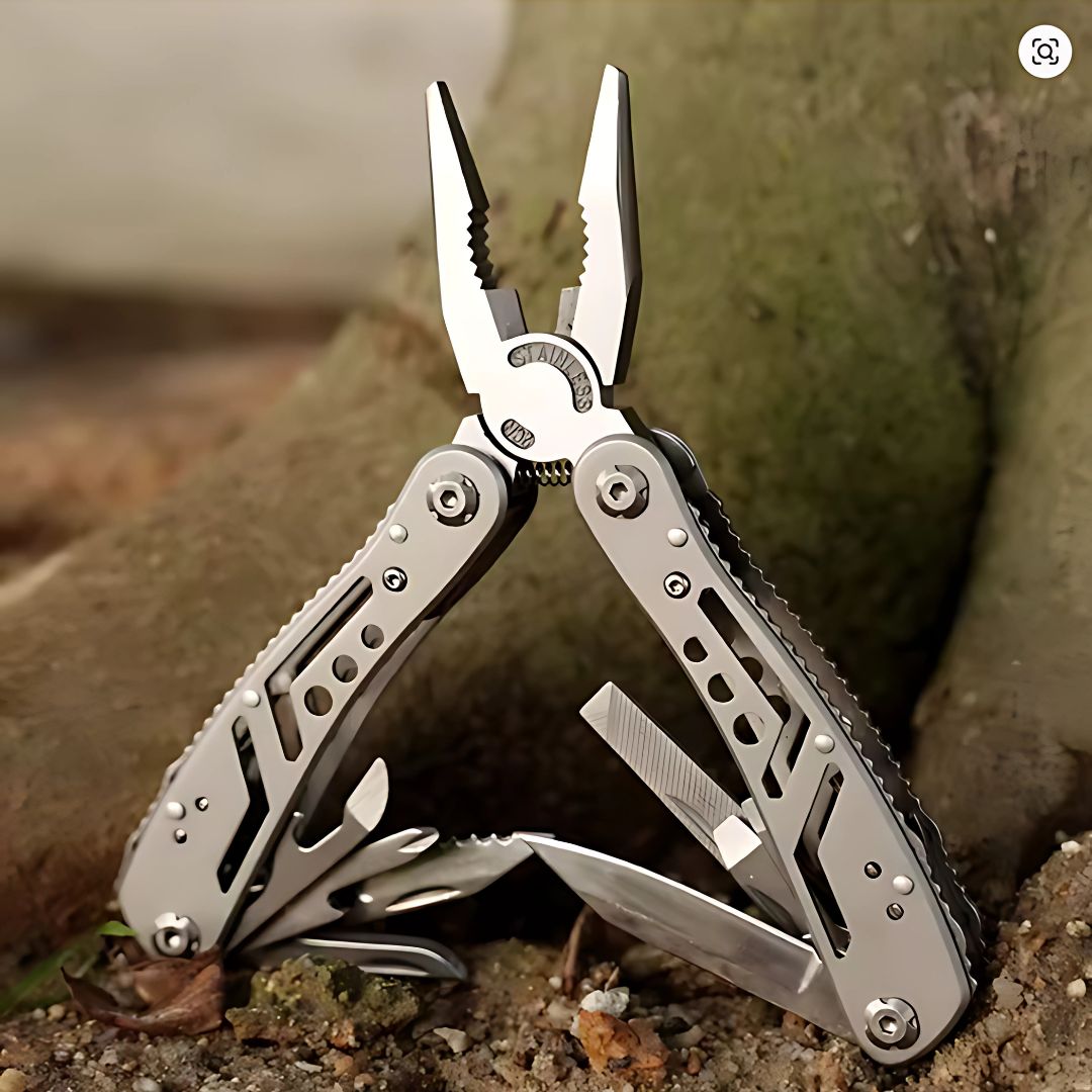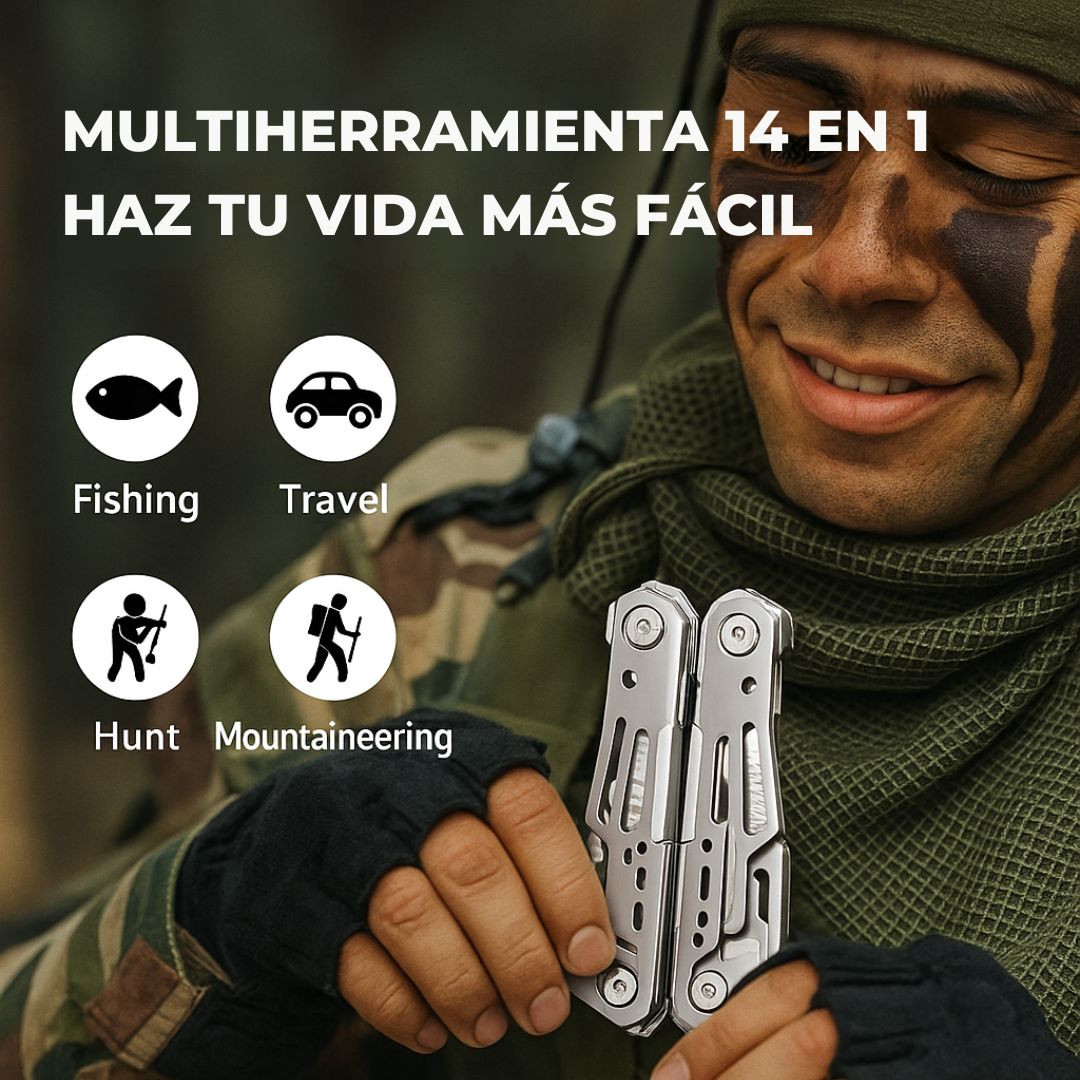 Herramientas: Alicates con resorte, cortador de alambre, cuchillo dentado, cuchilla principal, pelacables, abrebotellas, abrelatas, lima, destornilladores.